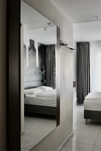 Standard Double Rooms are perfect for those seeking comfort in Oslo. Spanning 16-18 sqm, they include two 90cm beds, configurable together or separately. Amenities feature wifi, an open wardrobe, and a desk with a chair. These rooms are styled in a modern, minimalist Nordic design, focusing on simplicity and practicality.